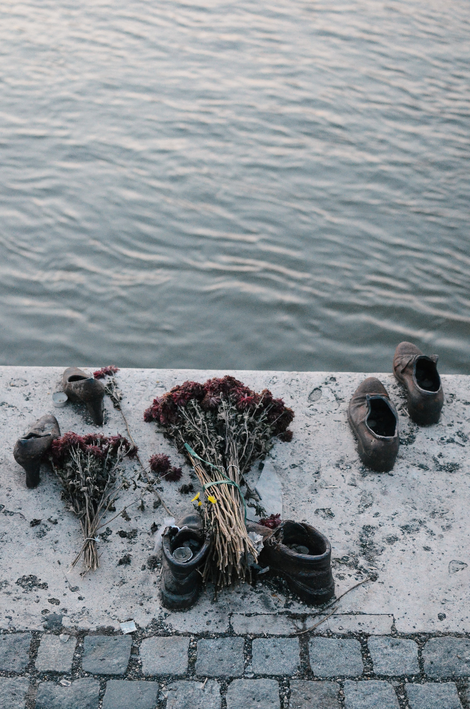 shoes on the danube during WWII hundreds of innocent men, women and children (Jews, gays, etc) were ordered to take off their shoes and shot at the end of the river, their bodies fell in and floated away.  it's a tragic story and beautiful memorial, completed in 2005